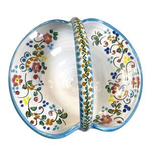 Gorgeous hand-painted ceramic basket made by Ceramica Artistica Cruz in Spain. This piece features colorful floral artwork, a hand-sculpted curved handle, and a pretty pedestal base. The bright, cheerful colors and traditional Spanish folk-art style make it a perfect decorative accent for your kitchen, entryway, vanity, or shelf styling.