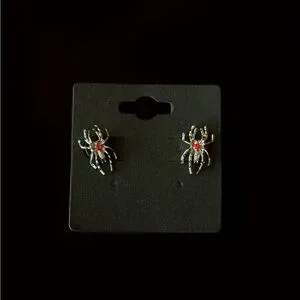 Stylish silver spider earrings featuring a striking red gem. Perfect for adding a unique touch to any outfit.