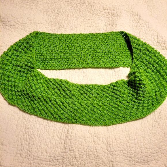 This Spring Berry Infinity Scarf is 100% acrylic in bright green. Can be washed in cold water with like colors, lay flat to dry, do not put in a dryer.