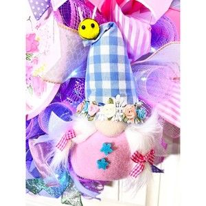 About 22 inches, 6 inch-deep door or mantle wreath. Pink & purple mesh back. Spring/ floral/ bumble bee/ gnome themed w/ vibrant colored wired ribbons (10 styles). An adorable floral gnome sign, plush gnome w/ bee on hat, mini honey bees and faux roses adorn this wreath.