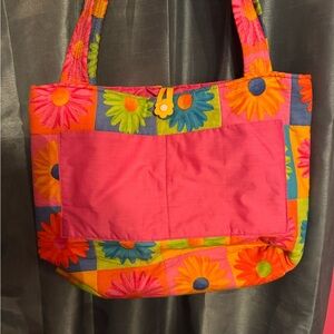 Huge floral blocked print with two large pockets on the front and the back. It also has five interior pockets, with two shoulder straps and a plastic yellow clasp. It is in great Preowned condition.