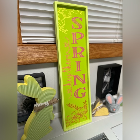 Handmade wood sign. Sign says “Hey there Spring” in bright glitter vinyl with flowers in spring colors. Sign is approximately 5”x18.25”. Non smoking, pet friendly home. All proceeds from my closet sales go to my fathers chemotherapy fund so thanks for looking! All items listed on multiple platforms. Bundle and save! Open to reasonable offers!