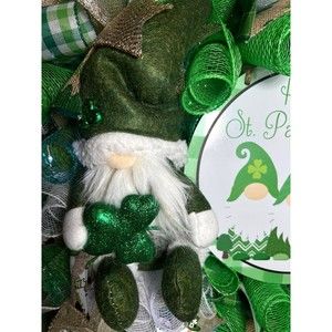 About 22 inches, 6 inch-deep door or mantle wreath. Green & white mesh back. Saint Patricks themed w/ vibrant colored wired ribbons (9 styles). A “Happy St. Patrick’s Day”gnome sign and a plush shamrock holding gnome adorn this wreath.