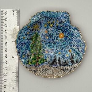 Van Gogh meets holiday cheer in this hand-painted scallop shell that looks like Christmas decided to crash an art museum. A swirling starry sky glows above a twinkling tree, each dot of color adding movement and magic. The gold-edged rim and metallic gold back give it that “I’m fancy but still fun” finish—perfect for gifting, displaying, or quietly admiring with cocoa in hand. Arrives gift boxed and includes clear display stand.