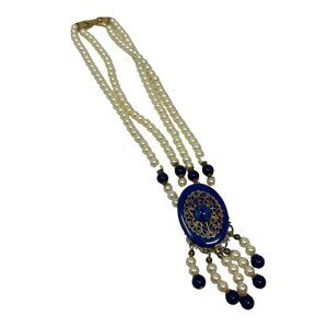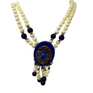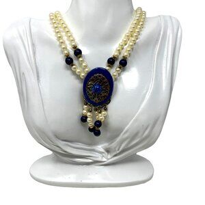 Handmade Statement Necklace Faux Pearl Blue Pendant Gold Tone Accents
