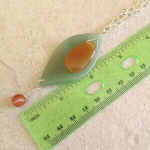 This statement necklace brings a soft touch of the tropics to your wardrobe. The large concave Aventurine blade is positioned to showcase the smaller tangerine banded Agate teardrop and introduces a touch of lush tropical colors to this composition. The layered effect lends itself to drawing attention to your girls and getting eyes on you for sure! The necklace is centered at app 20" in length with an additional 2" with a dangling Green Aventurine bead as an extender, to allow you more wiggle room to match the necklines of your tops and draw the gaze of the beholder to your assets. That said - this is a large link, bright silver plated chain - and you can hook that lobster claw clasp into any of the links to adjust the size for a perfect fit for you! Wear it with pride and knock them out!