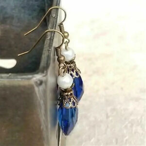 Handmade Steampunk Blue Faceted Glass Teardrop Antiqued Brass Dangle Earrings