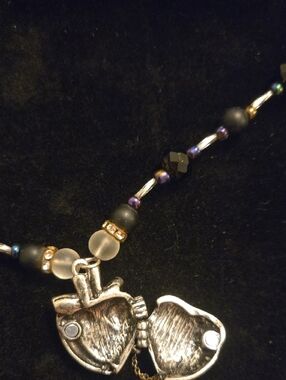 Eye-catching silver-tone steampunk heart pendant suspended on a black beaded chain with frosted accent beads. The black and frosted design adds edgy, modern contrast for day or night wear. Lightweight and versatile, this necklace layers easily with other favorites.