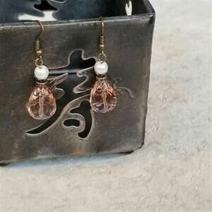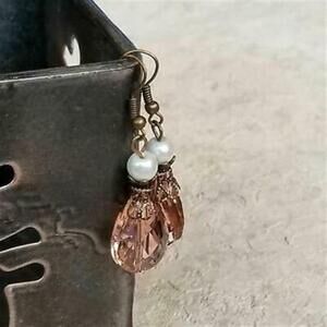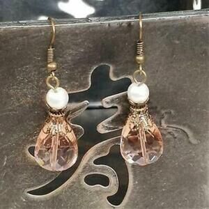 Handmade Steampunk Pink Faceted Glass Teardrop Antiqued Brass Dangle Earrings
