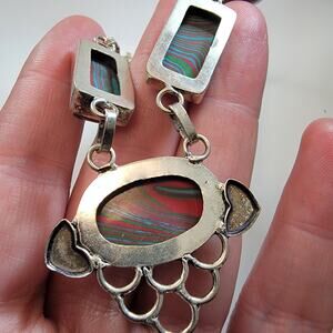 This stunning handmade necklace is a statement piece crafted from sterling silver and adorned with colorful polymer stones that feature bold, multi-striped patterns in vibrant shades of red, green, and blue. Each stone is uniquely shaped, including teardrop, rectangular, and oval designs, linked together in a flawless silver setting that enhances the striking colors. The centerpiece of the necklace features an eye-catching large oval stone, surrounded by smaller geometric pieces, creating a balanced and harmonious look. The necklace is approximately 20 inches in length, perfect for both day-to-day wear or adding a pop of color to your evening attire. The sterling silver chain is sturdy and fastens securely with a classic lobster clasp, making this necklace not only beautiful but practical too. This one-of-a-kind piece is sure to stand out in any jewelry collection, offering a fresh, modern twist on traditional design. Perfect for those who love vibrant, unique accessories.