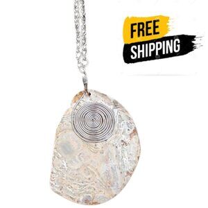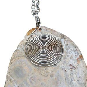 Featuring an unknown stone, this beautifully-crafted pendant is perfect for any occasion and wardrobe. Adorned with a decorative swirl made out of the same material as the chain, stainless steel, it serves as a wonderful piece of jewelry that'll certainly turn heads. Length: 24" We prefer to use stainless steel for its benefits. It’s hypoallergenic, does not tarnish, rust, or fade, and it is durable and scratch-proof— affordable and lasts a lifetime. Hand-shaped, hand crafted and handmade in Florida.