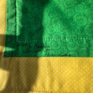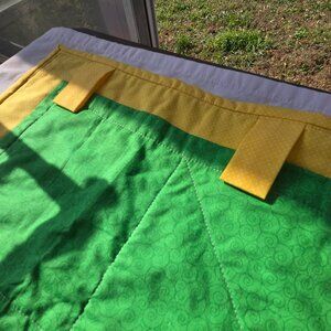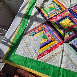 Handmade String Star Wall Quilt Small that measure approximately 29"x29". There are fabric slots on the back so you could hang up with a dowel rod on the wall and really brighten up a space. This is handmade and quilted with a sewing machine, it is signed on the back (see photos).