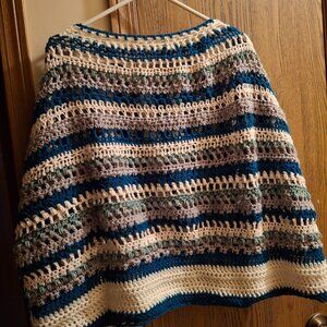 Handmade Crocheted Striped Cardigan, size 2X. Button Front with elbow length sleeves. Openwork stitches in bluish green, gray, and cream stripes. Nice for spring.