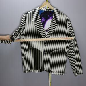 One-of-a-kind handmade blazer created in San Antonio, Texas. Navy/cream vertical-stripe cotton outer with oversized patch pockets and custom “Resurrection” skull-logo buttons. The interior is fully lined in a striking satin graphic print featuring vivid purples and blues—true wearable art and perfect for collectors or gallery fashion lovers. High-quality construction, unique detailing, and a tailored casual cut. Good condition. See measurements and photos. No size because this is a custom piece.