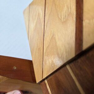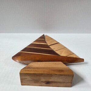 This wooden sailboat sculpture features a minimalist design, highlighting the natural beauty of wood. The contrasting wood tones create a striking visual appeal, making it a sophisticated addition to home or office decor.
