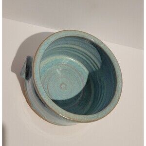This beautiful handmade art pottery bowl with a blue swirl glaze is a stunning addition to any collection. The unique production technique used by the artist creates a one-of-a-kind piece that is both functional and decorative. The bowl is made from clay and stoneware, and the handles make it easy to carry and serve. It is perfect for serving snacks or as a centerpiece on a table. The artist has signed the bowl, making it a special and unique piece.