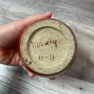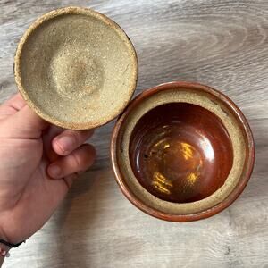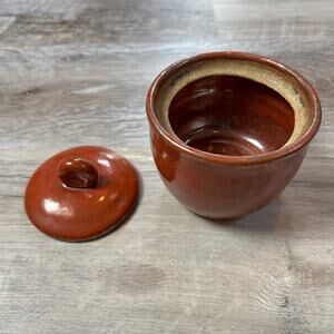 Charming handmade lidded jar signed “Marilyn” and dated 16–11. Deep rust red glaze with natural speckled clay interior. Great for salt, spices, keepsakes, or altar use. Rustic and warm-toned with beautiful handmade texture.