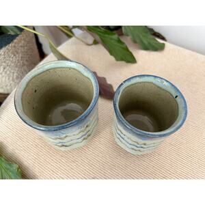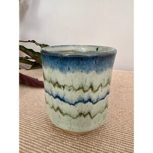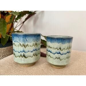 A pair of my favorite handmade mugs. These are a beautiful pair of vintage studio pottery tea/coffee cups. Not your dainty crystal drinking glass! These are unique and colorful. They feature a drip, ombre design in blue, green and creams. The interior is a speckeled beige. These are an artist's work and therefore not identical. I do not know the artist.
