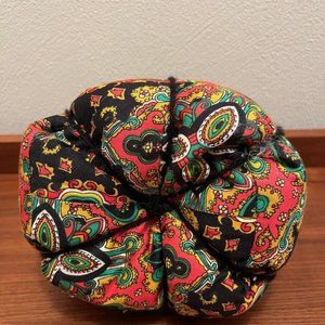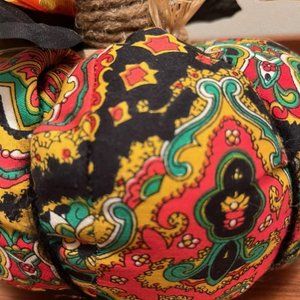 Just finished...cute Boho inspired pumpkin for Fall decorating. I make my pumpkins out of unusual fabric patterns because the traditional look & colors do not go with everyone's decor. This one is in a fun & bright black, gold, green, white & coral paisley pattern. It is weighted for stability and has a jute wrapped stem with raffia, black & green leaves & a gold colored mum as accents. Comes from a smoke free home.