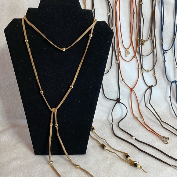Handmade suede bolo style lariat necklace features modern design with accent beads and charms. The necklace is styled in multiple layers, create your own look that can be worn in various ways. Multiple colors available