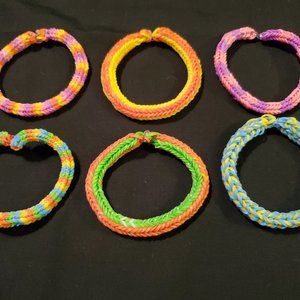 This Summer Fun Rubber Band Bracelet Set includes six colorful bracelets with orange mixed with light orange for definition, yellow, green, blue, purple, and pink that fits a 7 inch wrist with some stretch.