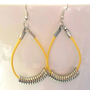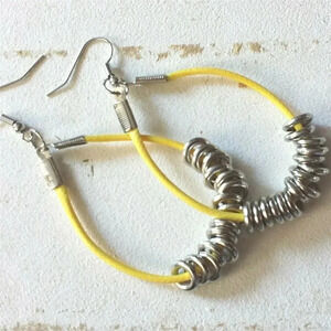 Handmade Sunny Yellow Long Polyester Cord Silver Tone Rings Dangle Hoop Earrings