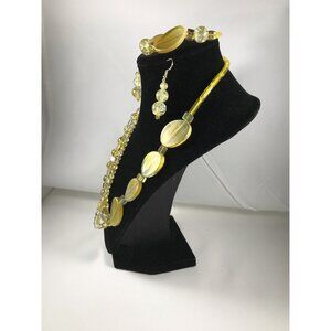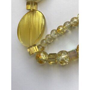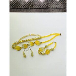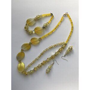 Handmade warm yellow, yellow and clear shattered effect glass and plastic beaded 20 13/16in necklace with gold claw clasp for both necklace and 8 13/16in bracelet; also matching 2in earrings