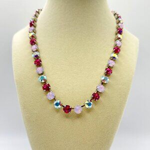Elevate your look with this stunning handcrafted Swarovski crystal necklace featuring a dazzling mix of pink, fuchsia, and Aurora Borealis crystals that catch the light beautifully. ✨ Set in silver-plated metal, this necklace exudes timeless elegance and luxury.