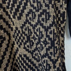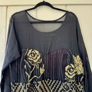 Handmade dress made of Upcycled 90s sweaters. The body is black with gold metallic floral & geo print. Sweetheart neckline. The top has black stretch sheer mesh and sleeves.