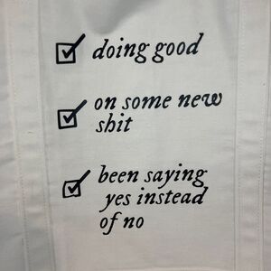 Hand sewn, heavy duty canvas tote bag with lyrics from “the 1” in vinyl. Perfect for computer, books, groceries. Durable canvas.