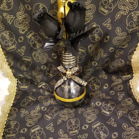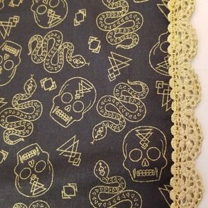 Ready for Halloween? This handmade black and metallic gold skulls table runner is perfect to add the Halloween spirit to accent your table. Fabric content is 100% cotton with no backing (see last picture). Metallic gold lace edging. Measures 45"Lx16"W. Glass light bulb shaped centerpiece is NOT INCLUDED.