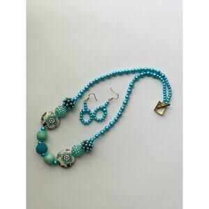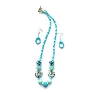 Handmade radiant teal stringed glass beads with 5 different types of contrasting design, yet matching color style glass, stone and with metal type beads. necklace is 21in long end to end, earrings are 1.75in long and 3/4in wide. decorative gold colored toggle clasp for necklace.