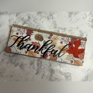 Decorative block sign with 'Thankful' text. Features autumn leaves and pinecone design. Perfect for seasonal decor.