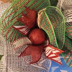 Handmade Christmas wreath. The colors of Christmas, red, green, silver, and white. Cute elf sign in the center. bundles of festive ribbons. About 26-inch round