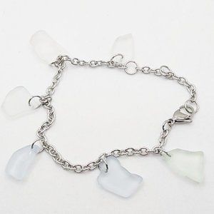 Handmade and hand crafted, this Clear Sea Glass Jewelry set is a must have for all wardrobes. It features an assortment of uniquely sized sea glass, not one the same. The chain is made out of stainless steel and, on the bracelet, is adjustable. We prefer stainless steel for its hypoallergenic properties, resistance to rust and tarnish, and longevity.