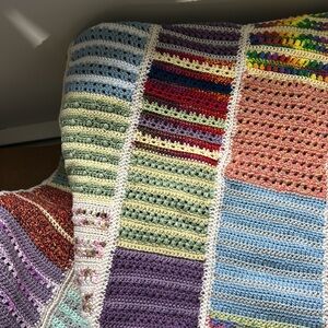 Handmade throw blanket, approximately 60 inches long, and 42 inches wide. And very good preowned condition, a loose thread here and there.