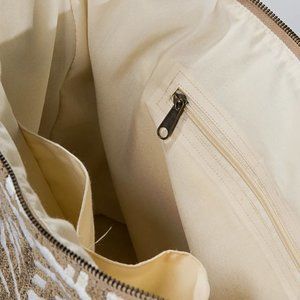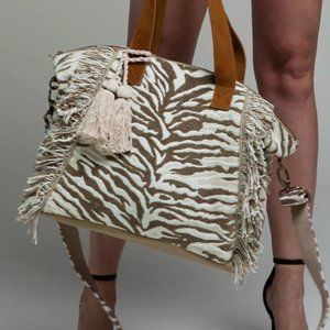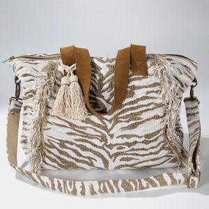 Make a *roarsome* statement with this handmade cotton/polyester tiger motif bag! Strap yourself in with an adjustable shoulder strap and make sure all your stuff is safari-secure with two slip pockets and a zipper pocket on the inside and outside. Add in a fringe accent and you'll have everyone roaring your name. #stripedfierceness