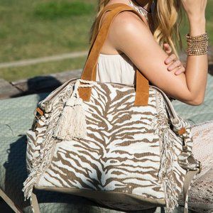 Make a *roarsome* statement with this handmade cotton/polyester tiger motif bag! Strap yourself in with an adjustable shoulder strap and make sure all your stuff is safari-secure with two slip pockets and a zipper pocket on the inside and outside. Add in a fringe accent and you'll have everyone roaring your name. #stripedfierceness