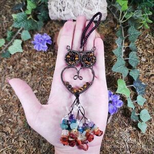 This piece measures 7" long and is hand-crafted with tiger's eye and obsidian. From the bottom dangles chips of red jasper, orange aventurine, citrine, turquoise howlite, amethyst and clear quartz. It has a woven loop at the top, making it perfect to hang on your wall, in your car, or even to wear on a necklace cord!