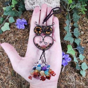 This piece measures 7" long and is hand-crafted with tiger's eye and obsidian. From the bottom dangles chips of red jasper, orange aventurine, citrine, turquoise howlite, amethyst and clear quartz. It has a woven loop at the top, making it perfect to hang on your wall, in your car, or even to wear on a necklace cord!