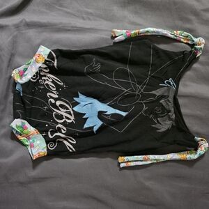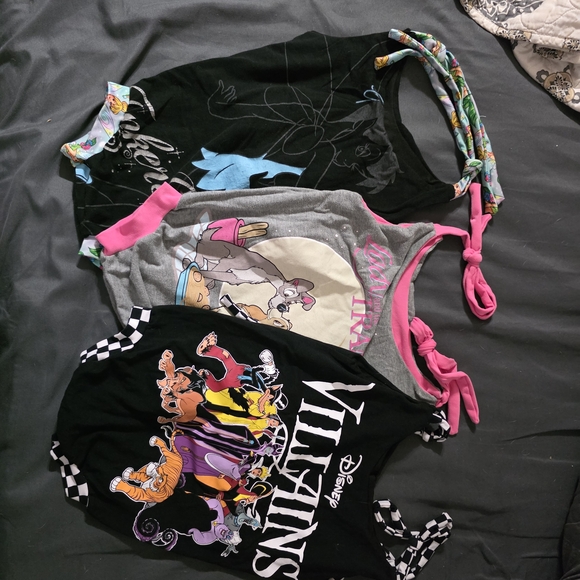 these handmade rompers were purchased from "the e crew" by upcycling t-shirts. tink and lady lady and the tramp were my own t-shirts from the early 2000's. the villains t-shirt was one she had that I chose.