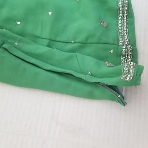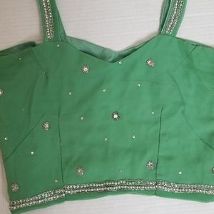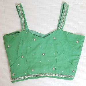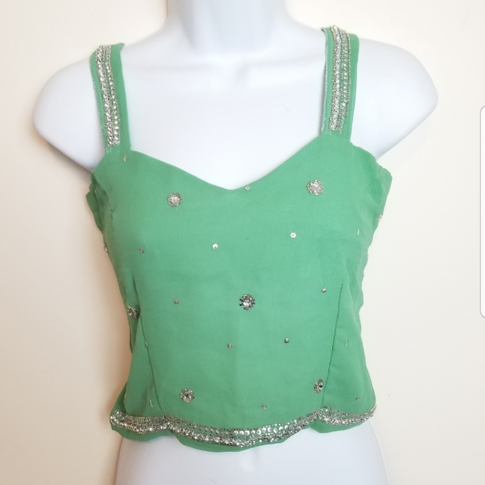 Gorgeous hand crafted green choli crop top blouse with sequin detail, princess seams, and side zipper for perfect fit. Made in India. Approx 14.5" across bottom and 18" to 19" pit to pit. Women's size medium.