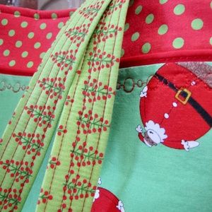 This new roomy tote bag was made by me. Features The Sock Monkey as Santas Little Helper, Checking the list of boys and girls! Fabric is by Moda, titled Santa's Little Helper by Erin Michael. Christmas colors of Green and Red with fun coordinating polka dots and mod trees. Perfect for Winter or give as a gift. Top border is edged in red piping and an embroidered circle stitch decoration has been added. The straps are longer so bag can be worn over the shoulder. Interior and straps are of fun mod looking trees. Featured on the interior are 3 slip in pockets, double on one side, single on the opposite.