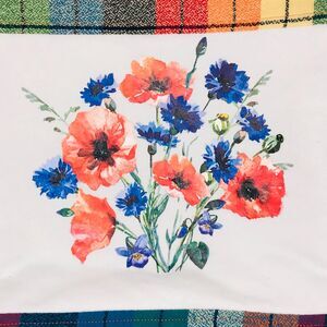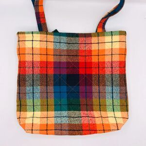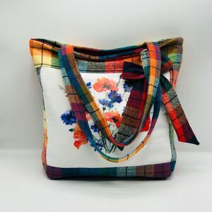 Handmade Tote Bag: Repurposed, Bright Bouquet on Plaid, Orange Blue Yellow Green