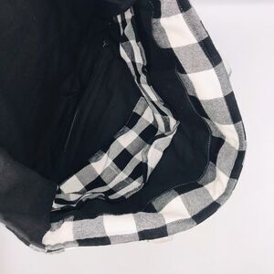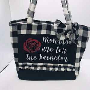 This tote features a delightful Mondays are for the Bachelor and is very basic, with 3 inside pockets. The flannel is a soft fabric in a black-and-white plaid. It also features a pretty bow attached to the carrying handle.