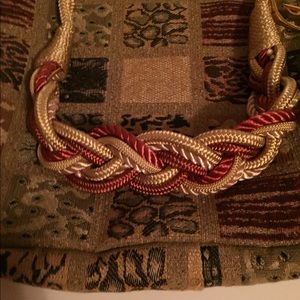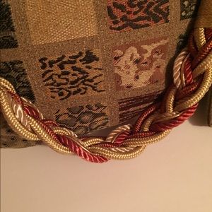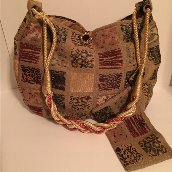 Beautiful Handmade Tote From Repurposed Tapestry Material With Matching Removable Wallet. Expertly Made with Braided Cord Handle, Fully Cotton Lined Interior with Large Slip Pocket. Loop and Button Top Closure. Handle has Hook To Attach Wallet. EUC no Rips or Stains. Measures (approx): 12”L x 12”H x 2.5” W with 15.5” Handle Drop