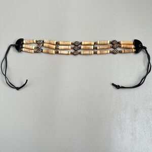 Choker measures 9 inches and faux leather sides measure 6" each. Total 21". Beaded, metal beads and most likely plastic beads. Good condition. Iroquois style? Costume?