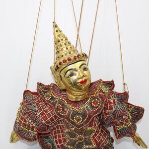 Discover a piece of captivating artistry with this exquisite handmade Burmese puppet. Its gleaming gold face radiates charm, framed by an elaborately detailed costume in rich reds and golds, adorned with shimmering sequins and intricate beadwork. Each ruffle and fold of the multilayered garment speaks to meticulous craftsmanship, designed to bring movement and life to your display. The puppet comes complete with its original string mechanism, ready to be operated or admired. Perfect for adding a unique cultural touch to your home decor, as a fascinating collectible, or as a delightful conversation starter at a themed party.