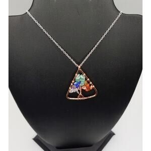 New handmade Tree of Life pendant necklace featuring a mix of genuine gemstone chips: clear quartz, amethyst, lapis lazuli, amazonite, citrine, and jasper. The pendant is wire-wrapped in copper and attached to a stamped 925 sterling silver chain.