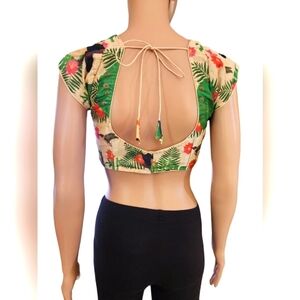 This top is beautiful and appears to be handmade, and extremely well so. The material has a sheen, almost like silk. The pattern is a tropical bird theme - parrots, cockatoos, peacocks! It's delicately lined and has lightly padded cups. There are hooks and braided loops for the hooks. A tie at the back of the back of the neck adds such a delicate, feminine touch!